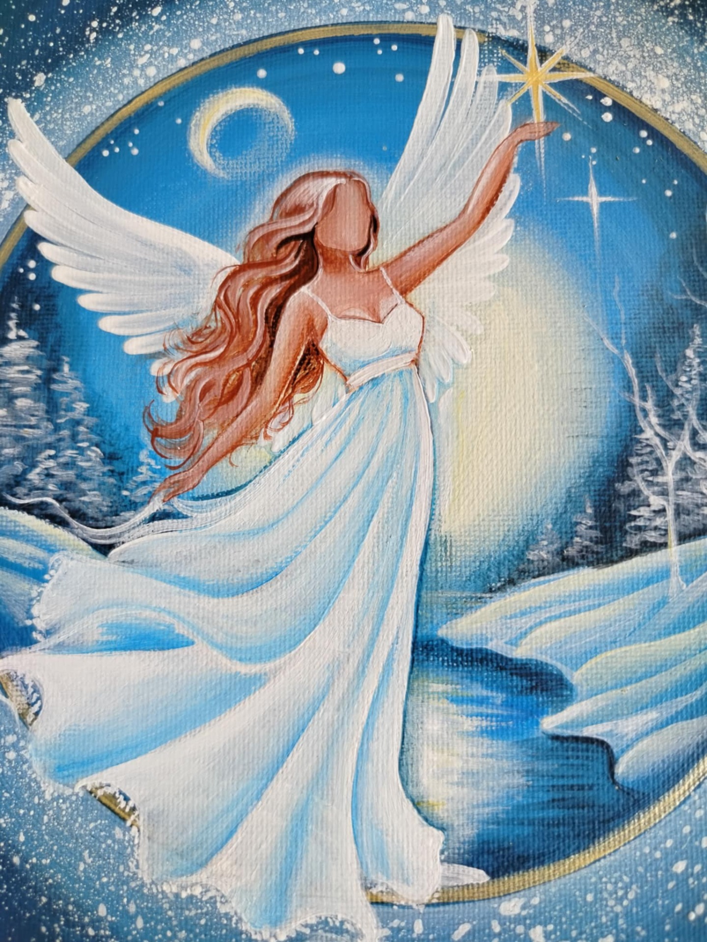 Anděl rozzářil první hvězdu na večerní obloze. Přináší naději v lepší zítřek, pokoru a lásku.Rozměr obrázku je 20x20cm, cena 1.660,-.V případě zájmu pište do sz .
