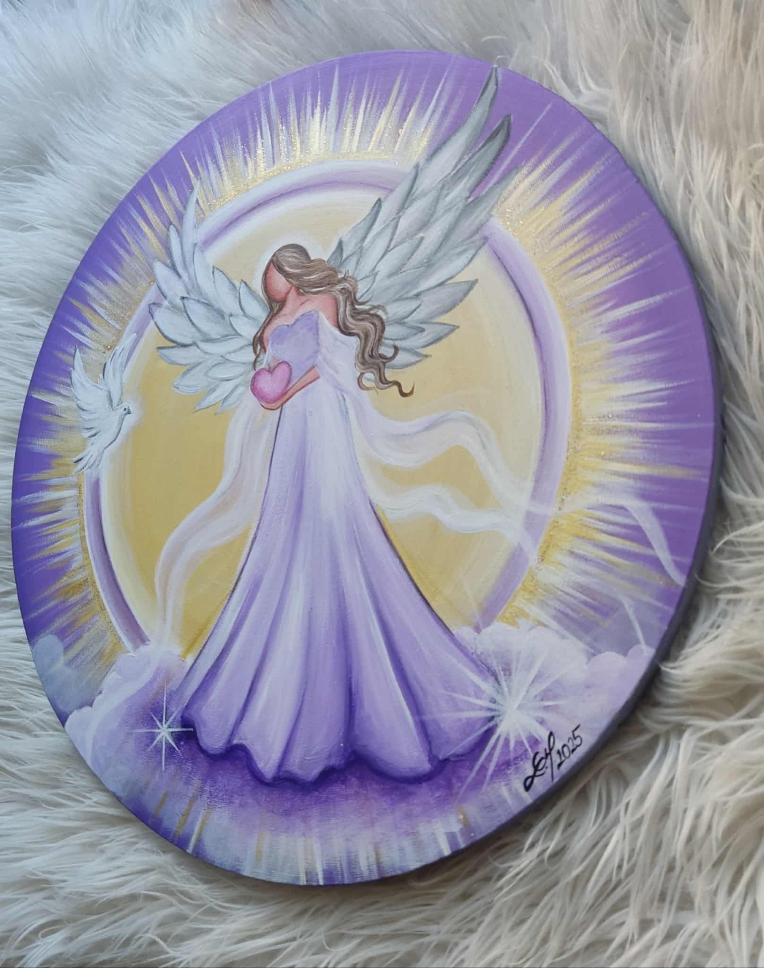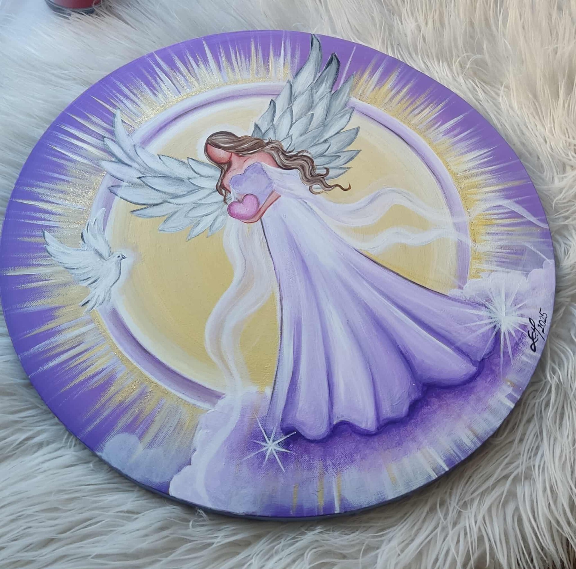 Andílek drží v ruce srdíčko jako symbol lásky. Za jeho zády se rozpínají krásná křídla a zářivá zlatá aura obklopena fialovým kruhem světla. Bílá holubička symbol čistoty a míru.