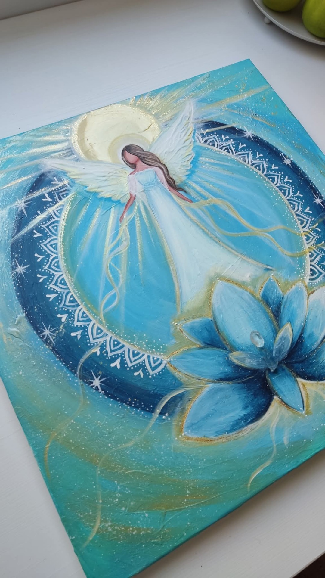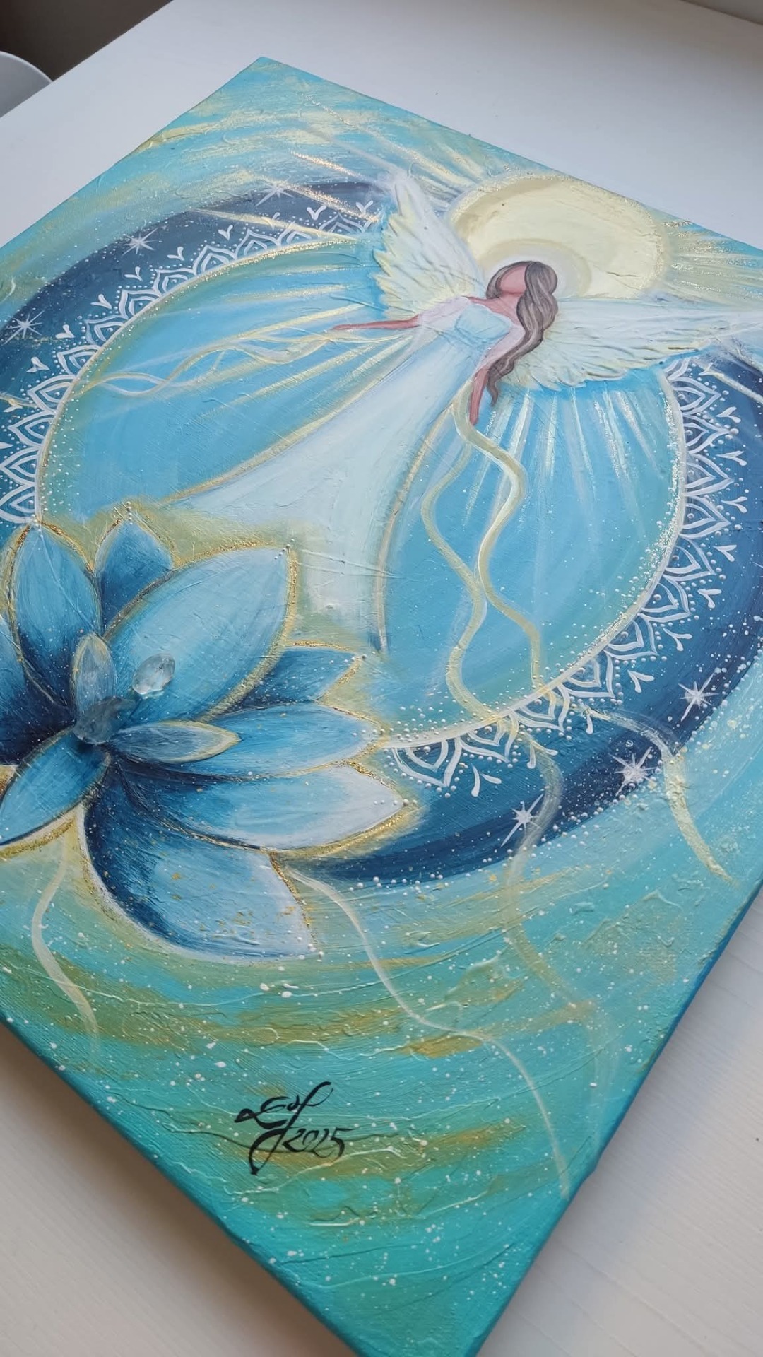 Struktura, třpyt a zlaté odlesky v krásných tyrkysových odstínech. Sluneční záře a sila. Zdobeno krystalky. 50*50cm.
